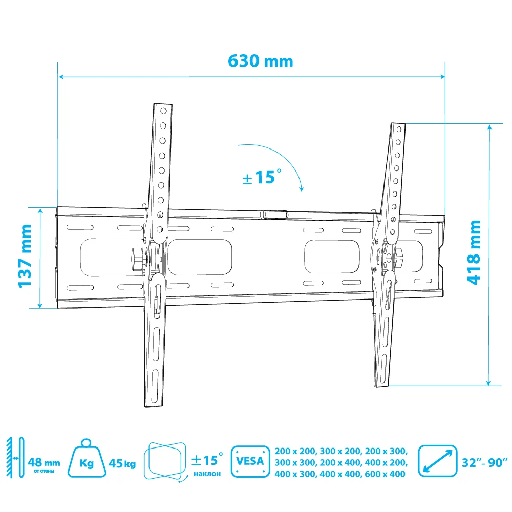 TUAREX OLIMP-202 BLACK надёжно удержит экран размером 32"-90" дюйма и весом 45 кг. Простая конструкция TUAREX OLIMP-202 BLACK идеально подойдет для самостоятельного монтажа. Наклонная конструкция регулировать экран вверх и вниз на ±15°.