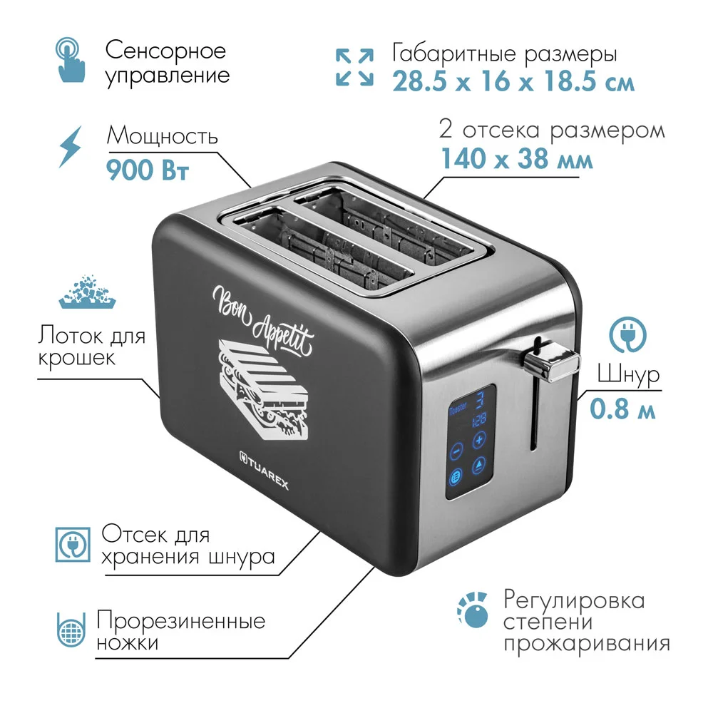 Представляем вам электрический тостер TUAREX TK-6002 - современное решение для превращения простых тостов в восхитительные лакомства. С мощностью 900 он приготовит идеальные тосты для вас и вашей семьи. Изысканный черно-стальной дизайн придаст вашей кухне элегантный вид.