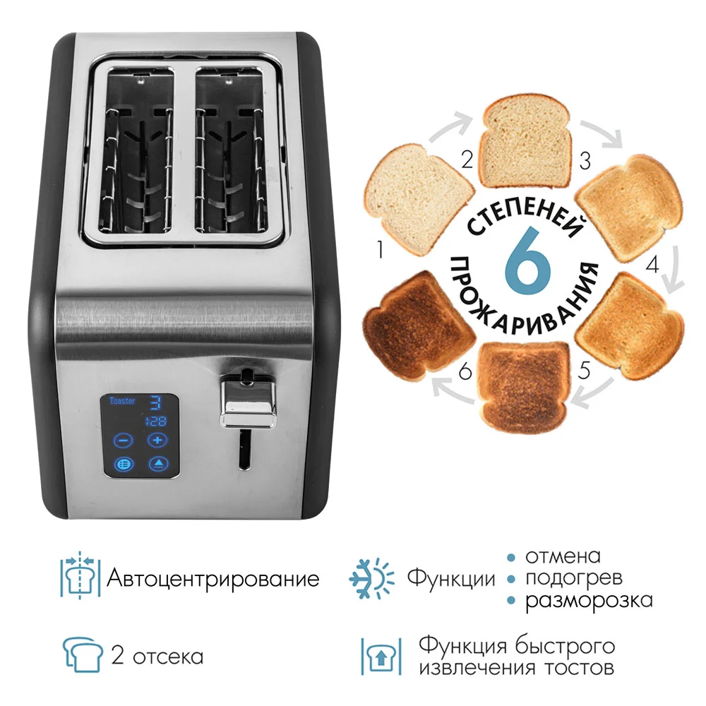 Тип управления: сенсорное, 6 степеней прожаривания, Функция автоматического центрирования тостов, Термоизолированный корпус, Функции разморозки, Функция подогрева, Функция отмены, Отсек для хранения провода питания, Съемный поддон для крошек, Прорезиненные ножки, Автоматический выброс тостов, LED-дисплей и сенсорное управление |