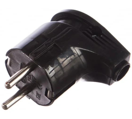 Угловая вилка с заземлением, черная 16А 250В UNIVersal - электротехнический элемент для сбора удлинителя или ремонта любого бытового электроприбора. Угловая конструкция очень удобна в применении, особенно при подключении к стационарной розетке в местах с ограниченным пространством.