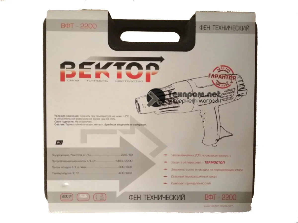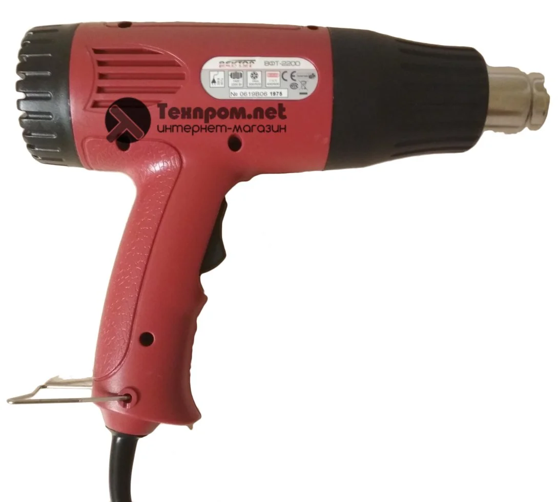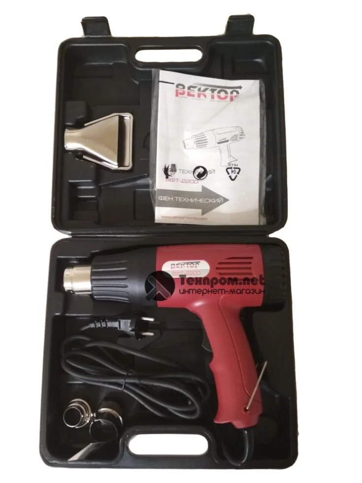 ВЕКТОР Фен технический ВФТ-2200 предназначен для снятия краски, остатков краски с дерева, металла и синтетических поверхностей, снятие и нанесение ПВХ бирок, плавки низкотемпературных материалов включая акрил и плексиглас, склеивание синтетических материалов фольги и ПВХ слоев, термоусаживание трубок, разогрева соединений труб и сгибание труб.