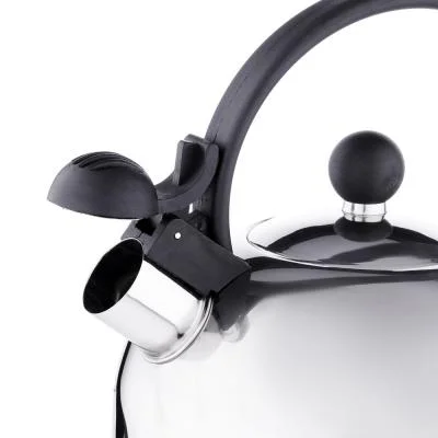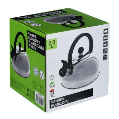 - Чайник объемом 2,5 л изготовлен из нержавеющей стали, зеркальный, с несъемным свистком и бакелитовой ручкой черного цвета, подходит для всех типов плит, кроме индукции.