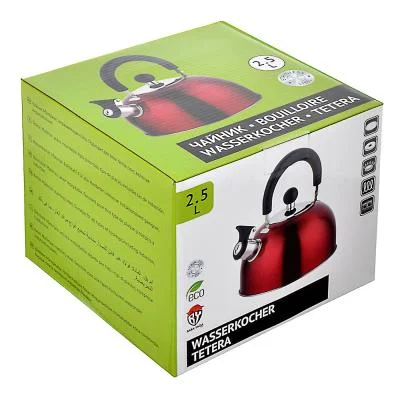 Чайник объемом 2,5 л изготовлен из нержавеющей стали, красного цвета, с несъемным свистком и бакелитовой ручкой черного цвета подходит для всех типов плит, включая индукцию.