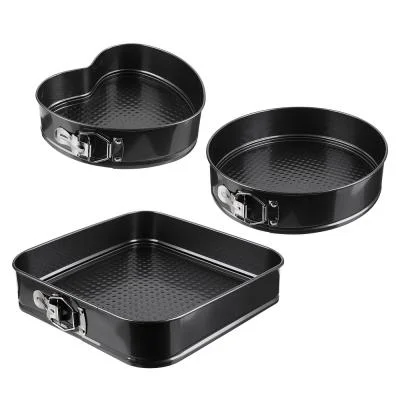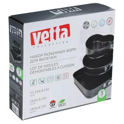 Набор из 3 разъемных форм для выпечки размерами: квадрат - 28х6,5 см, круг - d 26х6,5 см, сердце - 21,5х20,5х6,5 см, изготовлены из углеродистой стали с 2-х слойным антипригарным покрытием изнутри и снаружи и предназначены для использования в духовых шкафах.