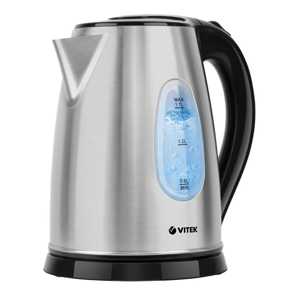 Надежный, мощный и стильный чайник VITEK VT-7052, корпус которого и внутренняя часть крышки изготовлены из высококачественной нержавеющей стали, станет неотъемлемой частью вашей кухни. Прибор буквально за считанные минуты нагреет 1,7 л воды, благодаря максимальной мощности в 2200 Вт. Чайник оснащен сертифицированным английским контроллером STRIX, который гарантирует устройству действительно долгий срок службы. Фильтр с металлической сеточкой, расположенный внутри носика прибора, защищает напитки от накипи. Окошко со шкалой уровня воды имеет красивую голубую подсветку, которая гармонично сочетается с благородным серебристым цветом корпуса. Пользоваться чайником очень удобно: крышка открывается автоматически — нажатием на кнопку. Кроме того, прибор способен поворачиваться на 360°. Да и ухаживать за чайником очень просто: благодаря тому, что нагревательный элемент встроен в плоское дно, устройство легко очищается от накипи.