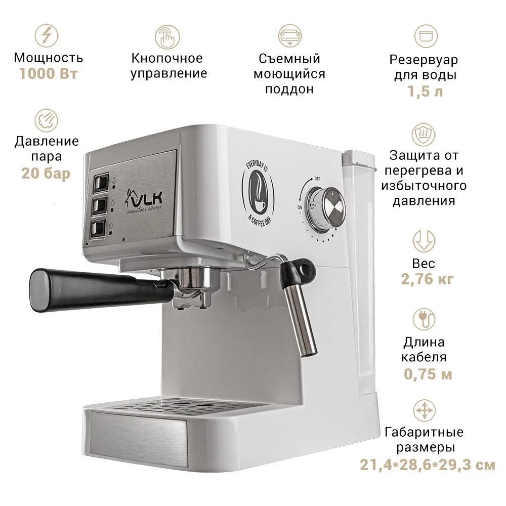 Изысканный белый пластиковый корпус делает VLK VENICE 6005 стильным акцентом на вашей кухне. Мощность 1000 Вт и давление пара до 20 бар обеспечивают потрясающий вкус и аромат в каждой чашке кофе.