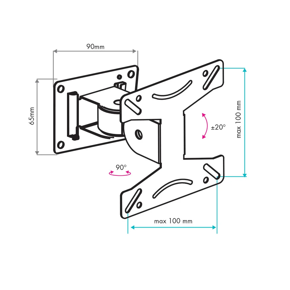 Конструкция кронштейна VLK TRENTO-102 позволяет поворачивать экран влево/вправо на 90° и изменять угол наклона вверх/вниз на 20°. Установленный на кронштейне телевизор будет располагаться в 100 мм от стены.