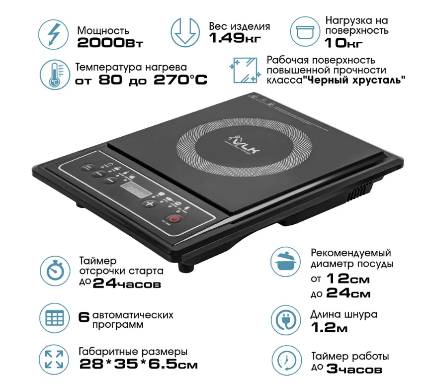 6 автоматических программ приготовления, Рабочая поверхность повышенной прочности класса "Черный хрусталь", Таймер отсрочки старта до 24 часов, Таймер работы до 3 часов, Функция автоотключения, Функция защиты от перегрева, Температура нагрева от 80 до 270 градусов, Рекомендуемый диаметр посуды от 12 до 24 см, Допустимая нагрузка на поверхность 10 кг, Функция защиты от скачков напряжения в сети