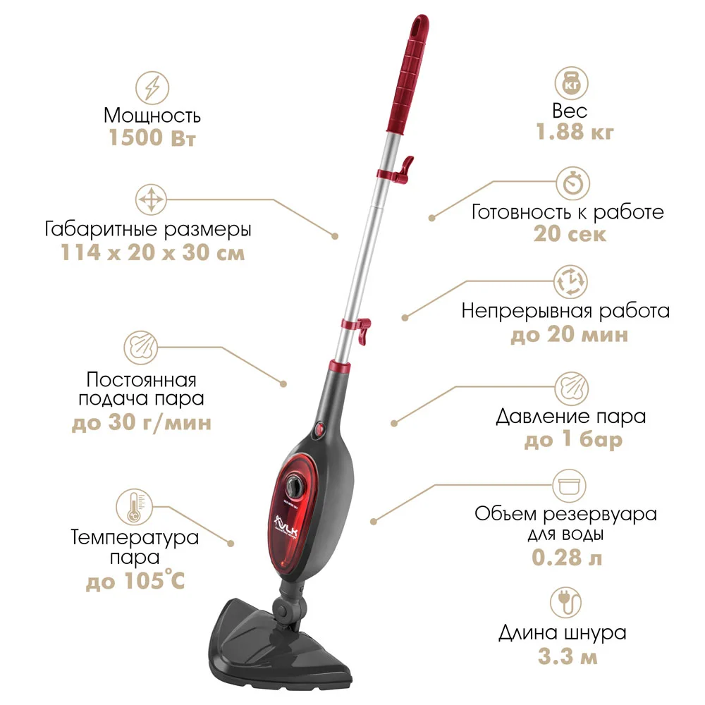 Конструкция корпуса 2 в 1: паровая швабра и компактный отпариватель, Использует пар для удаления грязи, пятен и чистки без использования чистящих средств, Подходит для очистки: деревянных и ламинированных покрытий пола, натуральный и искусственный камень, керамика, керамическая плитка, линолеум, металлическая поверхность, стекла, одежда, тканевая обивка мебели, Большой выбор сменных насадок позволяет использовать на максимум все возможности, Функция защиты от протечки воды, Функция защиты от перегрева, Функция автоотключения, Превосходно очищает и дезинфицирует обрабатываемые поверхности, Световая индикация на корпусе, Вращение насадки для пола на 180° для проникновения в труднодоступные места |