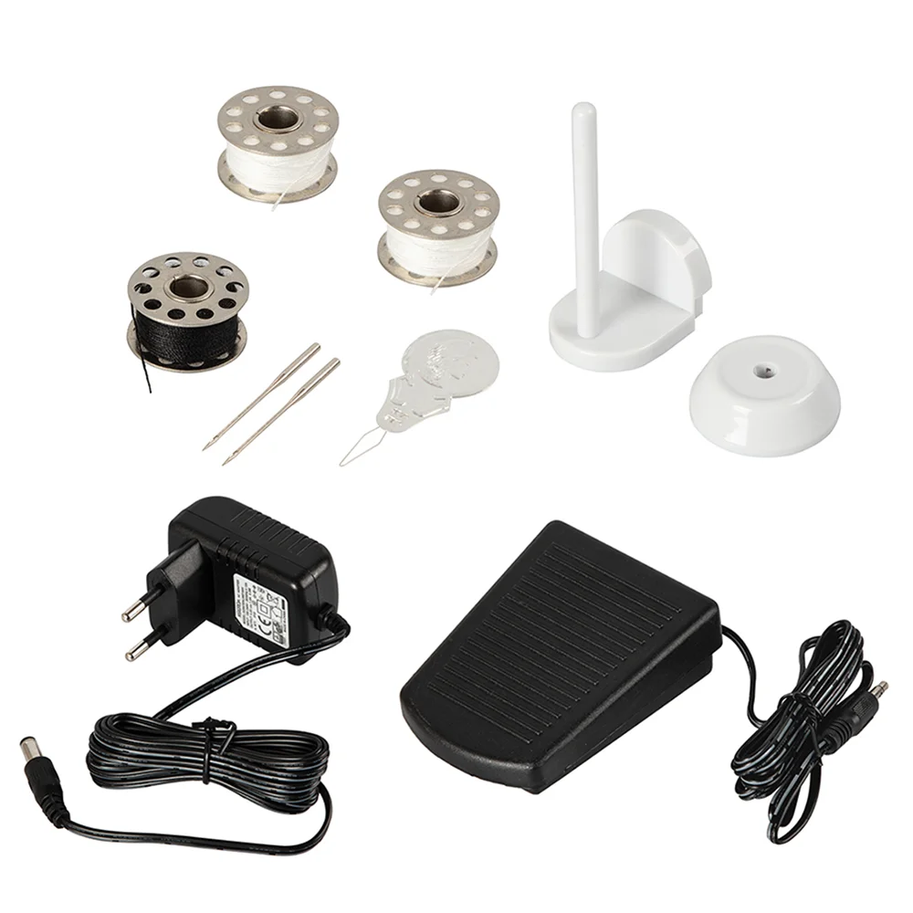 | Комплект поставки | Швейная машина, Шпуля, Иглы, Инструмент для заправки нити, Ножной привод, Сетевой блок питания, Гарантийный талон, Руководство по эксплуатации |