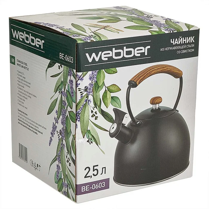 Чайник 2,5 л из нержавеющей стали со свистком, индукционное дно WEBBER BE-0603 черный, ручка дерево