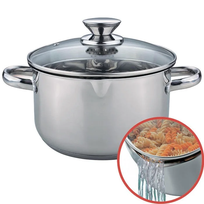 - Комбинированная крышка с двухсторонней перфорацией разного диаметра, обод кастрюли с носиками для удобного слива жидкости