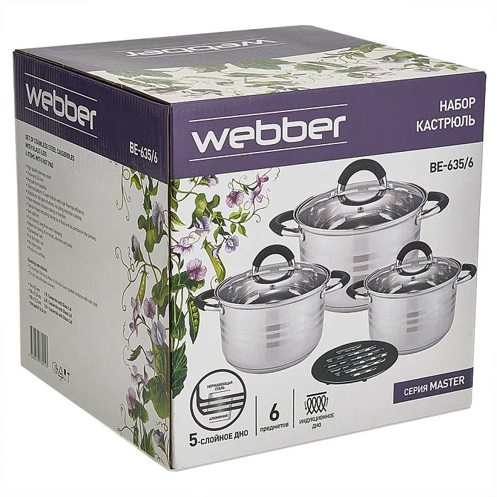 Набор посуды 6 предметов: 3 кастрюли (1,9 л, 2,8 л, 3,8 л) из нержавеющей стали со стеклянными крышками + подставка WEBBER BE-635/6