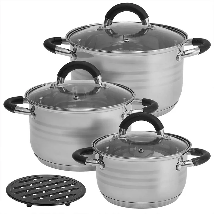 - Набор кастрюль из высококачественной нержавеющей стали со стеклянными крышками, с подставкой под горячее