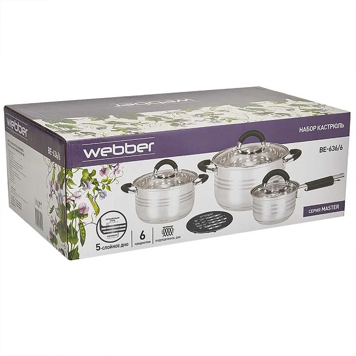 Набор посуды 6 предметов: ковш (0,9 л) и 2 кастрюли (2,7 л, 3,6 л) из нержавеющей стали со стеклянными крышками + подставка WEBBER BE-636/6