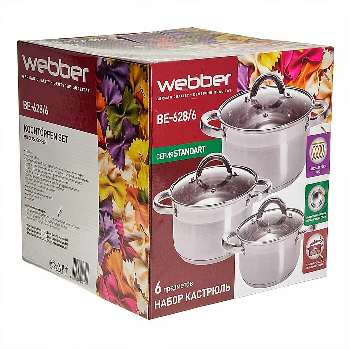 Набор посуды 6 предметов: 3 кастрюли (2,2 л, 3 л, 5,2 л) из нержавеющей стали со стеклянными крышками WEBBER BE-628/6