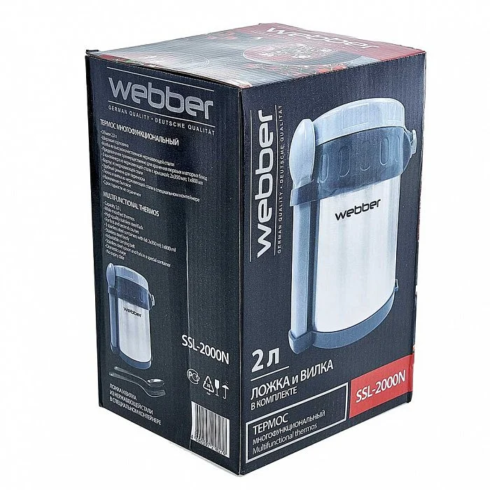 Термос пищевой 2 л WEBBER SSL-2000N с ложкой, вилкой и 3 контейнерами из нержавеющей стали