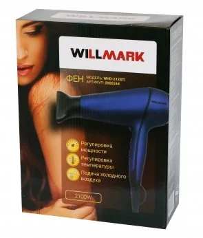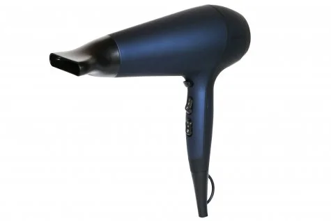 Прибор предназначен для бытового использования. Корпус фена изготовлен из термостойкого пластика тёмно-синего цвета с покрытием SOFT TOUCH и чёрной вставкой. Это делает его приятным на ощупь и комфортным в использовании. На корпусе расположена петля для подвешивания фена. С тыльной стороны прибора установлен пластиковый фильтр с покрытием SOFT TOUCH для препятствия попадания волос. Размер прибора без установленной насадки концентратора 205х275 мм, мощность 2100 Ватт. На ручке расположены кнопка подачи холодного воздуха, кнопка температурных режимов и кнопка мощности. Кнопка температурных режимов имеет три режима, кнопка мощности два режима В комплект к фену прилагается насадка концентратор. Длина сетевого шнура фена 165 сантиметров с сечением провода 2х0,75мм.
