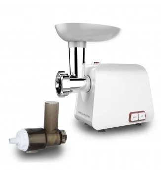 Электрическая мясорубка WILLMARK WMG-2043JW обладает расширенным набором функций и аксессуаров. В комплект прилагаются руководство по эксплуатации, две решётки для мясорубки с пропускными отверстиями 5 и 7 мм., пластиковый толкатель, насадка для сосисок и насадка «КЕББЕ». Эта насадка используется для приготовления традиционного восточного блюда и используется для получения полых трубочек из фарша, которые затем наполняются начинкой и обжариваются. В руководстве по эксплуатации приведен рецепт приготовления данного блюда. В комплект к данной модели также идёт насадка соковыжималка для томатов и мягких овощей и фруктов! Сверху расположен широкий загрузочный поддон. Рабочая часть устанавливается на мясорубку под наклоном и поворачивается до вертикального положения, а снимается путем нажатия на кнопку расположенную на передней части корпуса и поворотом её вправо. На корпусе расположен переключатель работы мясорубки. Начало работы осуществляется при нажатии на кнопку «ON/OFF». Положение «REV» для очистки рабочей камеры и вращения шнека в обратную сторону - РЕВЕРС. Привод мотора выполнен из металла во избежание проворота и вывода из строя мясорубки. Две ножки прибора изготовлены в виде присосок для фиксации мясорубки на столе. Номинальная мощность прибора 1000 Вт, максимальная мощность при блокировке вала достигает 2000Вт. Длина сетевого шнура без вилки 80 сантиметров c сечением провода 2х0,75 мм.