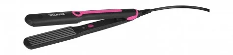 Корпус стайлера выполнен из черного термостойкого пластика матовой фактуры с розовыми глянцевыми вставками. Размер изделия 290х33х35мм. На внутренней части изделия приклеен стикер показывающий место греющей части, а также переключатель включения/выключения со световым индикатором включения. Пластины ГОФРЕ изготовлены из алюминия с керамическим покрытием РТС черного цвета. Размер пластин 90х28 мм. Потребляемая мощность прибора 40 Ватт, Рабочая температура пластин 230 градусов Цельсия. Длина сетевого шнура стайлера 165 сантиметров с сечением провода 2х0,5мм. Используйте стайлер для создания волн, зажимайте пряди волос прибором и удерживайте в течение 2-3 секунд. Не используйте прибор для распрямления абсолютно мокрых волос.