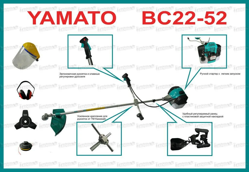 YAMATO Бензотриммер ВС22-52+штанга предназначена для скоса травы и мелкого кустарника на относительно больших площадях, имеет возможность скоса травы на неровных участках и в труднодоступных местах (вблизи вертикальных поверхностей - стен, заборов, вокруг деревьев и столбов, а также под кустами и садовыми скамейками).