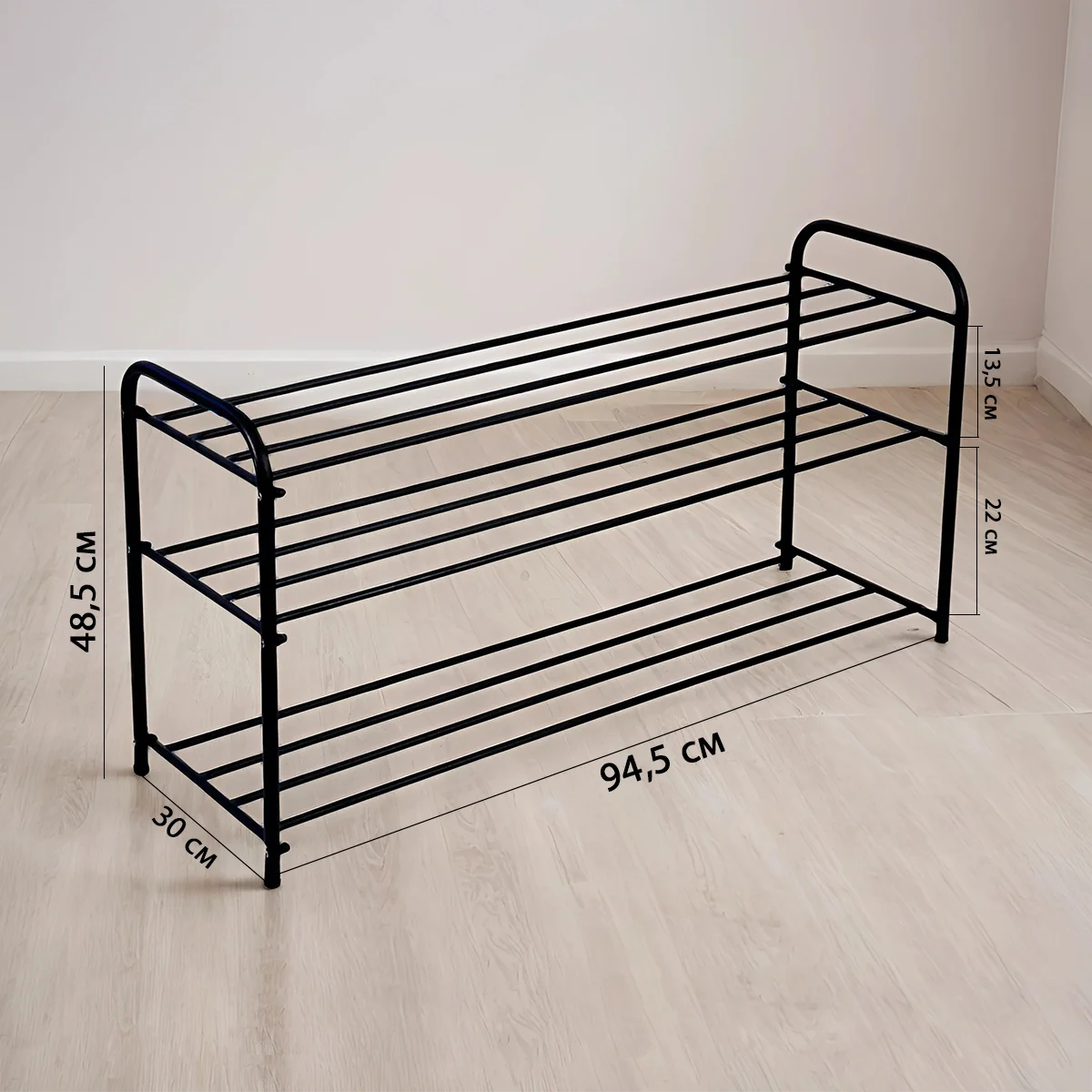 Каждая полочка выдерживает нагрузку до 12 кг, а на 3 яруса шириной 94 см вмещается до 12 пар обуви.