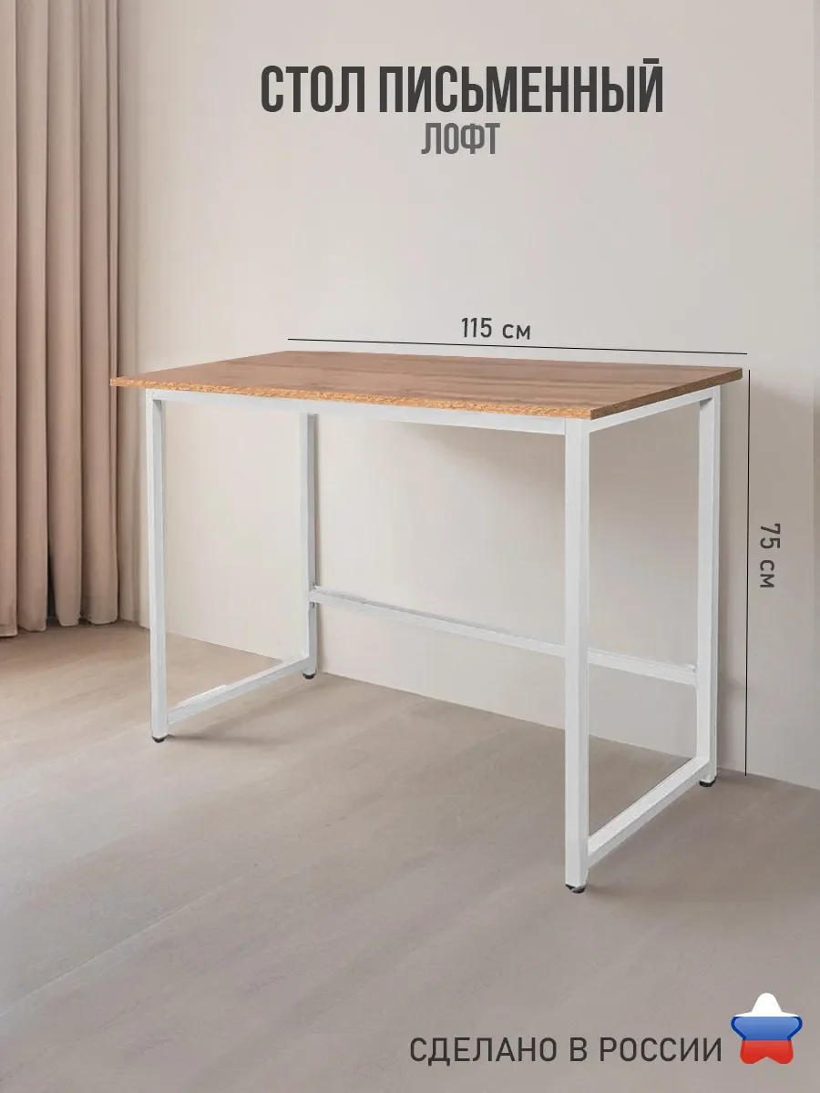 Столешница 115х60 см выполнена из ламинированного ДСП (ЛДСП) в коричневом цвете «Дуб вотан». Этот материал делает поверхность долговечным и не требует особого ухода. Ножки оснащены специальными заглушками, которые предотвращают появление царапин на напольном покрытии и полу, а так же регулируются по высоте.