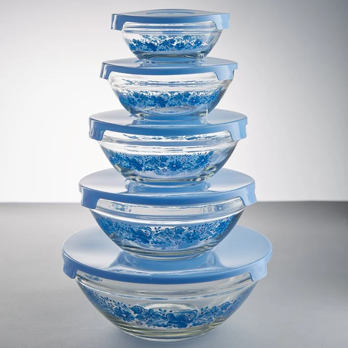 - Набор из 5 круглых мисок из упрочненного стекла с декоративным рисунком