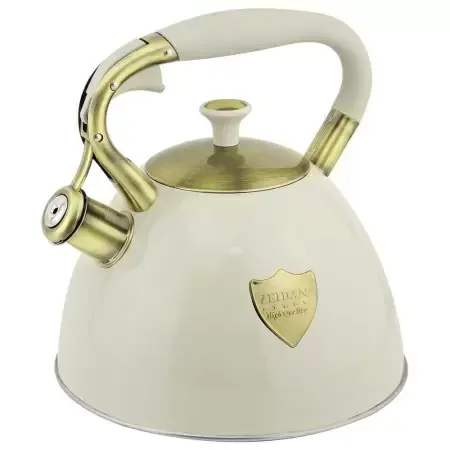 Чайник со свистком рассчитан на 3,0 л, изготовлен из нержавеющей стали, капсулированное индукционное дно, курковый механизм, внешнее покрытие - антипригарное цветное покрытие, устойчивое к высоким температурам, комбинированная ручка с покрытием "soft-touch", декоративные элементы "под бронзу".