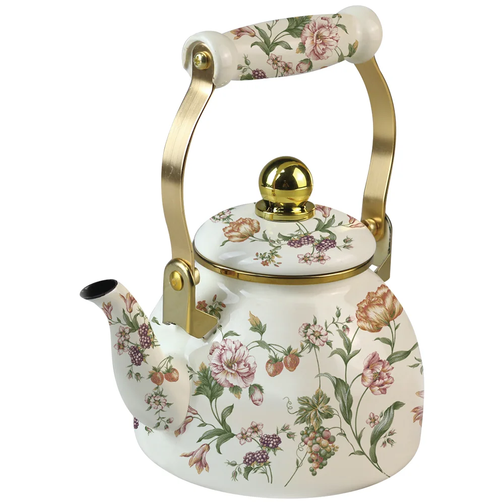 Эмалированный чайник, объем - 1,3 л, эмалированная сталь, съемный фильтр из нержавеющей стали, комбинированная ручка, "под золото", внутреннее эмалированное покрытие, ручка на крышке с декором, наружное покрытие - эмаль с рисунком. Подходит для индукции. Подарочная упаковка.