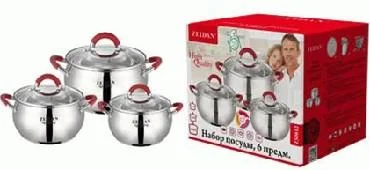 Набор посуды, 6 предм. ((3 КАСТРЮЛИ С КРЫШКАМИ:, 2.1 Л (?16 см ), 3.0 Л (?18см ), 4.0 Л (?20см )), нержавеющая сталь, внутренняя и наружная зеркальная полировка, шкала литража, крышки - стекло, ручки с силиконовым покрытием, 3-х СЛОЙНОЕ КАПСУЛИРОВАННОЕ ДНО, ПОДАРОЧНАЯ КОРОБКА.