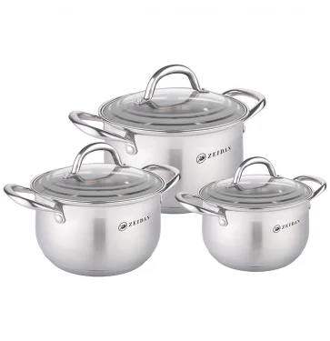 Набор посуды ZEIDAN Z-50649 6 предметов, 3 КАСТРЮЛИ С КРЫШКАМИ: 4.0 л (d20 см ), 3.0 л (d18 см ), 2.1 л (d16 см ), нержавеющая сталь, 5-ти СТЕПОВОЕ КАПСУЛИРОВАННОЕ ИНДУКЦИОННОЕ ДНО, крышка с матовой тонировкой, комбинированная полировка снаружи, матовая полировка внутри. Подарочная упаковка с пластиковой ручкой.