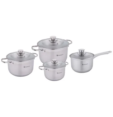 Набор посуды, 8 предм. (4 КАСТРЮЛИ С КРЫШКАМИ: 4,0 Л (Ø20 см ), 5,1 Л (Ø22 см), 6,6 Л (Ø24 см ), 8,2 Л (Ø26 см ), нержавеющая сталь, 5-ти СТЕПОВОЕ КАПСУЛИРОВАННОЕ ИНДУКЦИОННОЕ ДНО, крышки - стекло, ручки на корпусе и крышке "ПОД ЗОЛОТО", комбинированная полировка снаружи, матовая полировка внутри. Подарочная упаковка.