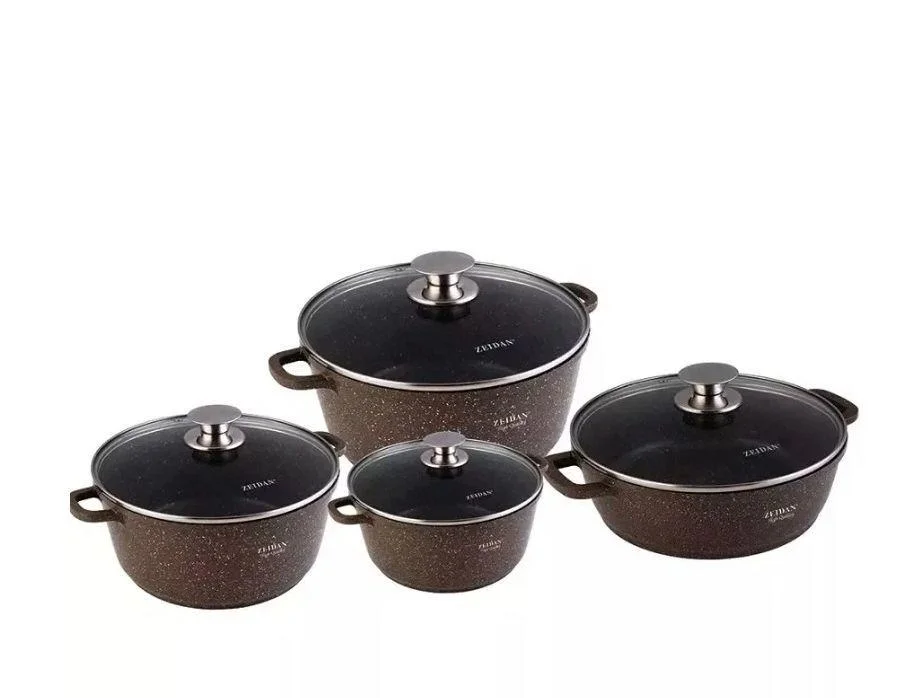 ZEIDAN Z-50816 CLASSIC Набор посуды, 8 предметов Z-50816 изготовлен из высококачествен-ного литого алюминия с внутренним и внешним антипригарным покрытием «GRANITE QUEENHOME».Литой алюминий отличается долговечностью и способностью быстро и равномерно нагреваться и аккумулировать тепло, что приводит к экономии энергии испособствует быстрому приготовлению пищи. Эргономичные ручки, к которым прилагаются силиконовые накладки. Крышка из жаропрочного стекла оснащена отверстиемдля выхода пара. Подходит для всех видов плит, кроме индукционной.Упаковка – подарочная коробка с пластиковой ручкой. В набор входят: Кастрюля с крышкой O 20 см – 3,0 л Кастрюля с крышкой O 24 см – 5,0 л Кастрюля с крышкой O 28 см – 7,8 л Жаровня с крышкой O 28 см – 4,8 л Характеристики Внутреннее и внешнее покрытье «GRANITE QUEENHOME» Крышко-стекло металический ободок Материал литовый алюминий Силиконовые накладки Есть Металлическая ручка на крышке Подходит для всех видов плит, кроме