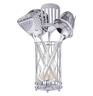 Кухонный набор из 7 предметов: лопатка с прорезями, шумовка, половник, картофелемялка, поварская ложка, поварская вилка. Изготовлен из высококачественной нержавеющей стали, которая чрезвычайно устойчива к коррозии, воздействию разного рода кислот и щелочей (не окисляется).