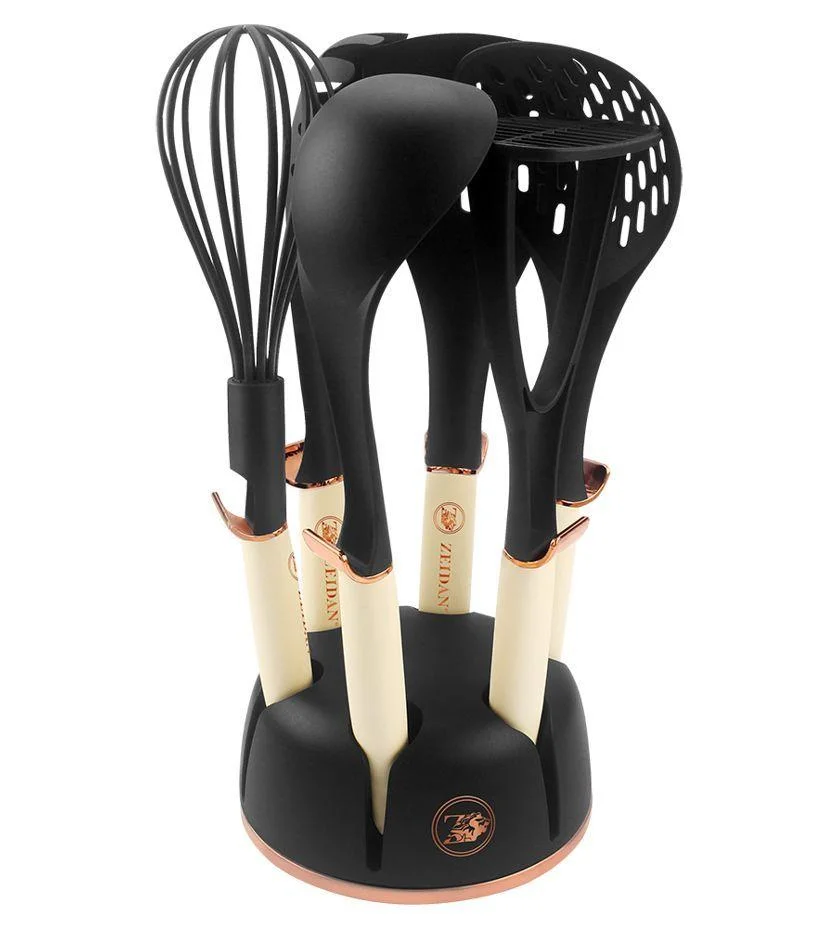 ZEIDAN Z-2066 Кухонный набор ZEIDAN Z-2066 7 предметов, Кухонный набор 7пр. ВЫСОКОКАЧЕСТВЕННЫЙ ЖАРОПРОЧНЫЙ НЕЙЛОН, подставка, лопатка с прорезями, шумовка, половник, картофелемялка, ложка для спагетти, венчик для взбивания, ручки soft-touch с декоративным элементом "под золото"