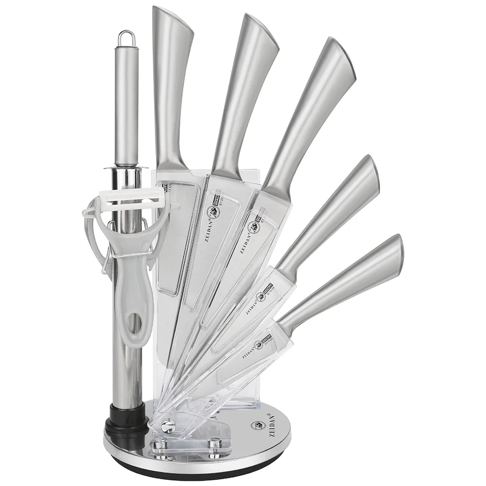 Набор ножей 9 предметов. Лезвие ножей из высококачественной нержавеющей стали: нож поварской - 1,5mm/8", нож для хлеба - 1,5mm/8", нож разделочный -1,5mm/8", нож универсальный - 1,2mm/5", нож для овощей – 1,2mm/3,5", ножницы, овощечистка, прорезиненные ручки под дерево, подставка для ножей.