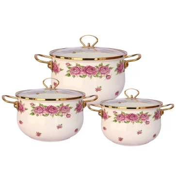 Набор эмалированных кастрюль , 6 предм. (3 КАСТРЮЛИ С КРЫШКАМИ: 2.4 Л (d18 см), 3,2 Л (d20 см), 5,7 Л (d24 см) с внутренним и внешним трехслойным эмалированным покрытием, материал - углеродистая сталь. Ручки на корпусе и крышке "под золото". Подходит для индукции. Подарочная упаковка.