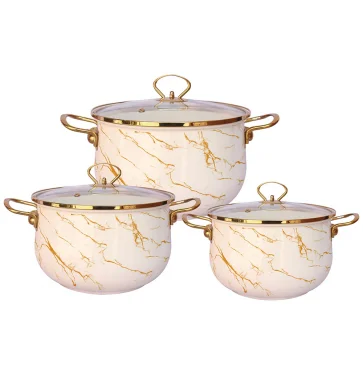 Набор эмалированных кастрюль , 6 предм. (3 КАСТРЮЛИ С КРЫШКАМИ: 2.4 Л (d18 см), 4,4 Л (d22 см), 7,0 Л (d26 см) с внутренним и внешним трехслойным эмалированным покрытием, материал - углеродистая сталь. Ручки на корпусе и крышке "под золото". Подходит для индукции. Подарочная упаковка.