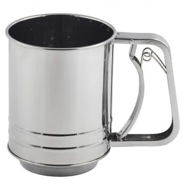 Кружка-сито - ёмкость для просеивания муки, сахарной пудры, манки, какао и других мелких сыпучих продуктов. Кружка состоит из корпуса с двойным ситовым дном и ручки, внутри которой находится пружина. Благодаря ручке-рычагу вы с легкостью просеете муку и другие сыпучие продукты.