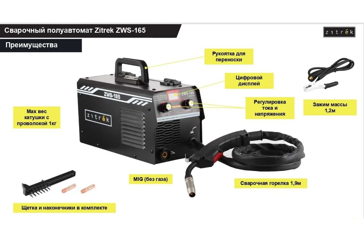 Сварочный полуавтомат Zitrek ZWS-165, MIG без газа, 165А (артикул 051-4691) предназначен для сварочных работ методами MIG и MAG без газа. Инструмент может применяться для сварки различных видов металлов.