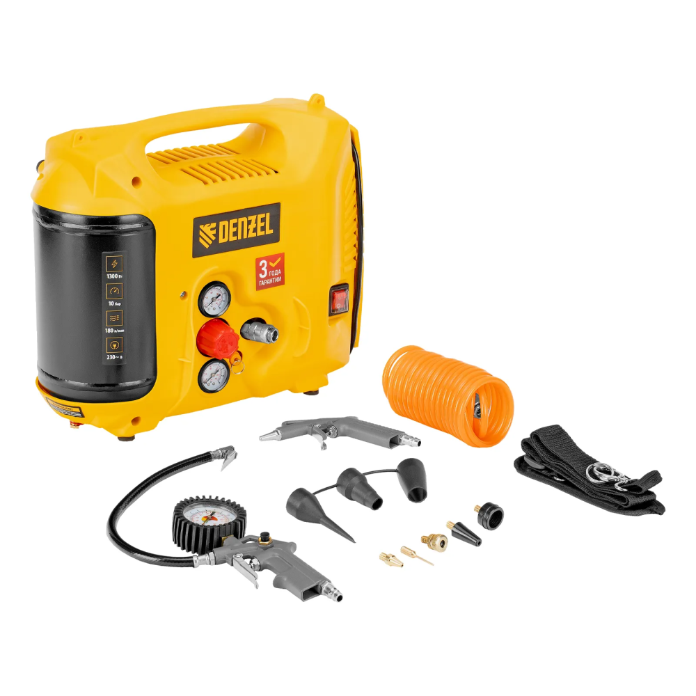 Компрессор воздушный Denzel DL1300 58011 мощностью 1,3 кВт, с максимальным рабочим давлением 10 бар, обеспечивает производительность 180 л/мин и поставляется с набором аксессуаров. Предназначен для обеспечения сжатым атмосферным воздухом нейлеров, степлеров, продувочных пистолетов, окрасочных и мовильных пистолетов и других пневмоинструментов, не требующих большого объема воздуха. Компрессор идеален для накачивания автомобильных шин, лодок, матрасов, мячей и прочих надувных изделий, а также для продувки труб водоснабжения.