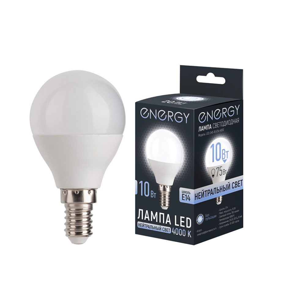 Технические характеристики Лампа светодиодная Energy LED G45-10-E14-4000. 109319-SK