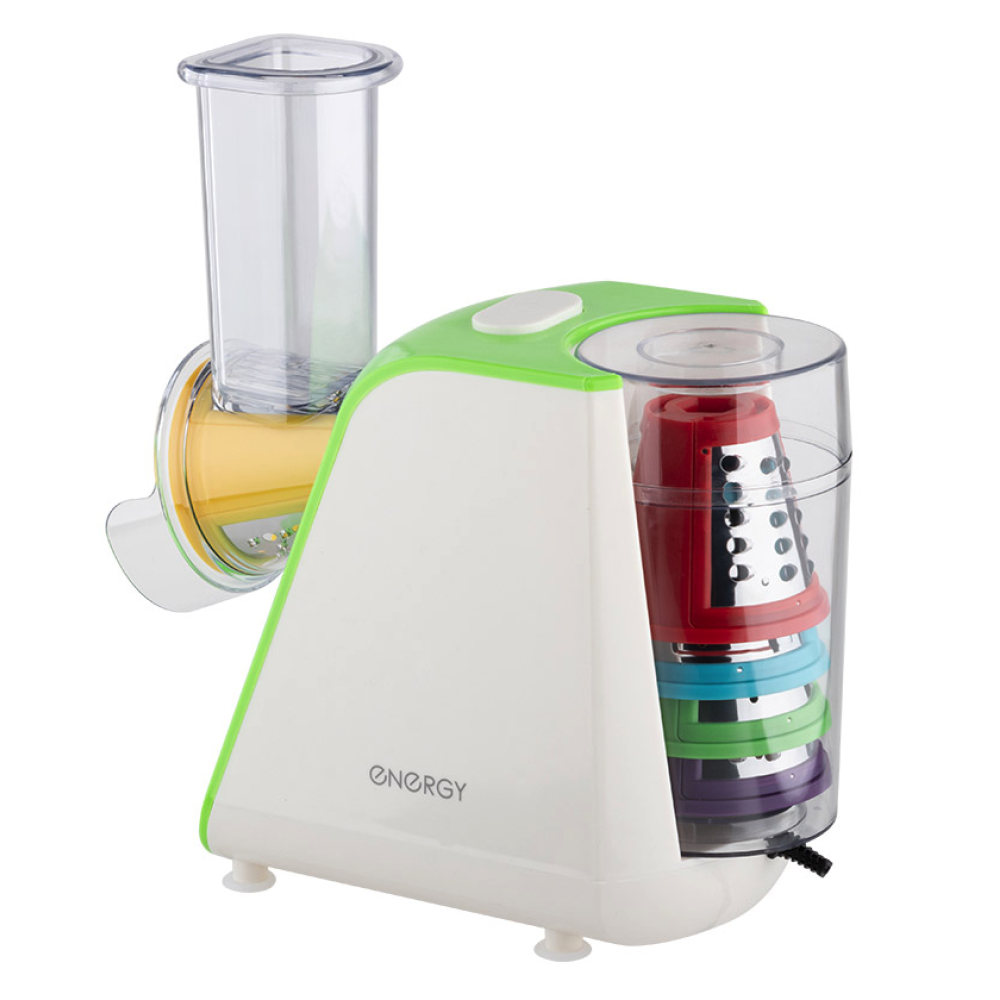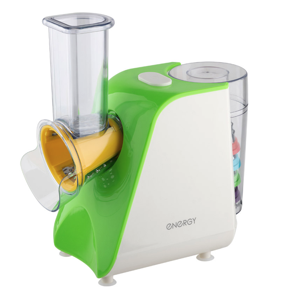 5 насадок для нарезки и шинковки: - для нарезки толстыми ломтиками - для нарезки тонкими ломтиками - для мелкой шинковки - для крупной шинковки - для измельчения 1 скорость Удобное хранение насадок Длина шнура 90 см Толкатель Мощность 250 Вт