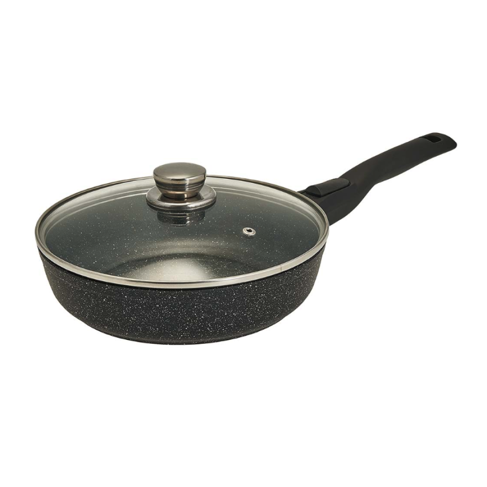 - Сковорода из литого алюминия с антипригарным покрытием, со съемной ручкой и стеклянной крышкой