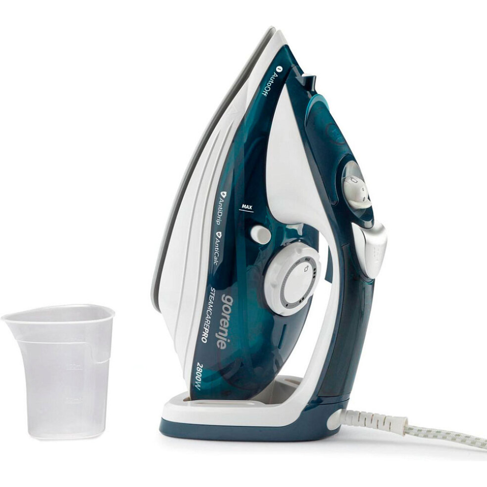 Утюг Gorenje SIH2800TQC синего/белого цвета — проводной утюг с различными функциями для эффективного глажения одежды.
