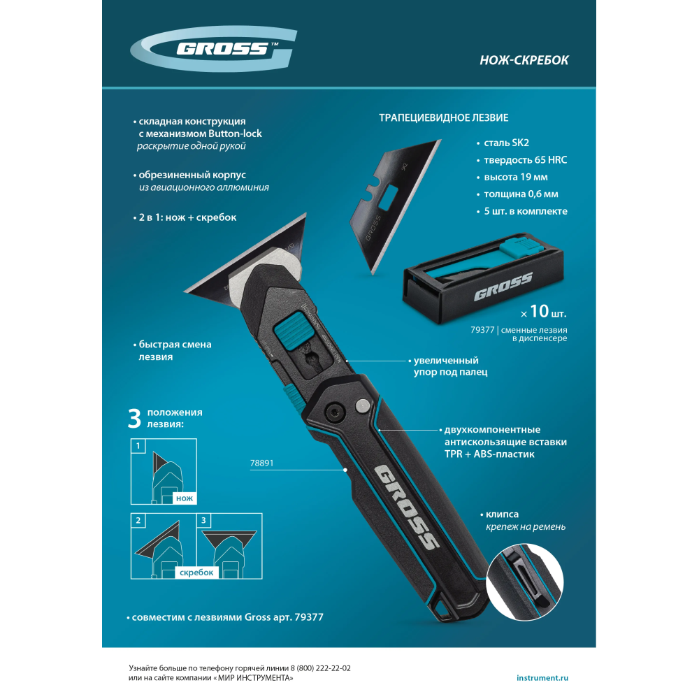 Технические характеристики Нож-скребок складной, 19мм, сменное лезвие, SK2, 5 запас. лезвий, алюмин. корпус, клипса GROSS 78891