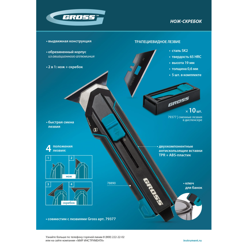 Нож-скребок выдвижной, 19мм, сменное лезвие, SK2, 5 запас. лезвий, алюмин. корпус GROSS 78890