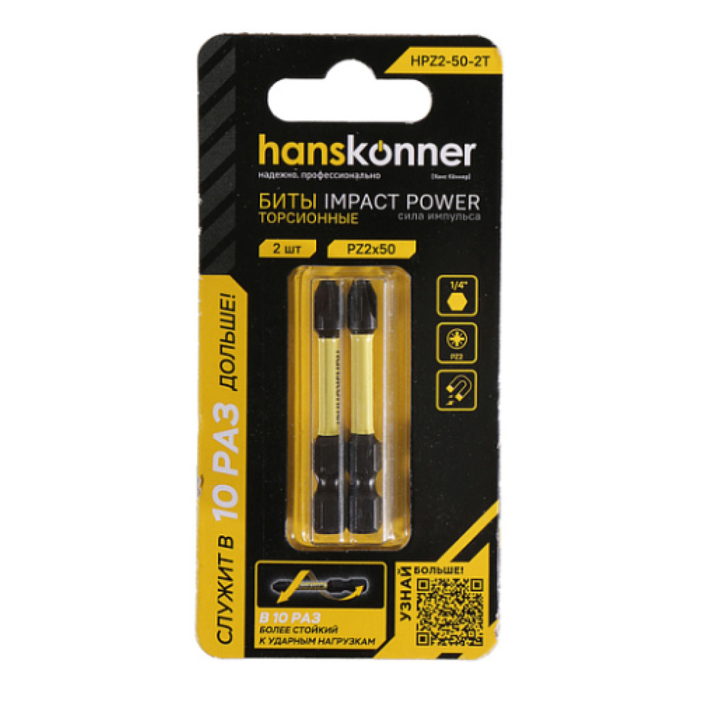 Технические характеристики Биты PZ2x50мм, ImpactPower, торсионные, 2шт, Hanskonner HPZ2-50-2T