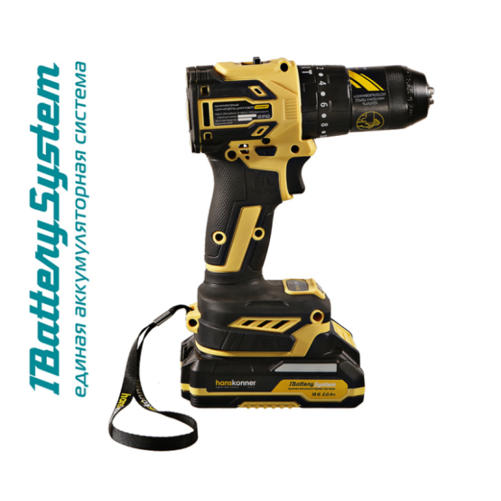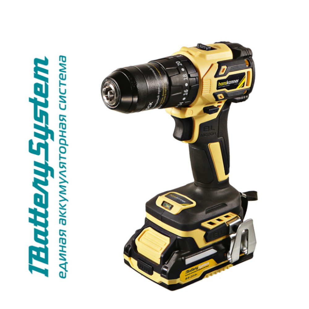 Hanskonner HCD2065BLIС – аккумуляторный 18 В, ударный, двухскоростной шуруповерт – является частью системы 1BatterySystem, обеспечивающей совместимость одного и того же аккумулятора с целым рядом наименований инструмента. Модель обладает максимально сбалансированной компоновкой: небольшие размеры корпуса и рукояти позволяют эффективное использование инструмента в условиях с затрудненным доступом, а нейтральный центр тяжести, и обилие прорезиненных противоскользящих поверхностей способствуют надежному хвату, и лучшему контролю в процессе работы. Шуруповерт оснащен 18 В бесщеточным двигателем, характеризующимся на 30% лучшей производительностью в сравнении с коллекторными аналогами. Кроме того, бесщеточный двигатель отлично справляется с кратковременными перегрузками и не склонен к перегреву. Благодаря применению мощного планетарного механизма High Torque Technology, Hanskonner HCD2065BLIС обладает высоким показателем максимального крутящего момента, достигающего 65 Н м. Имеет две скорости: режим пониженных оборотов (0 – 450 об/мин) предназначен для работ с крепежом, режим повышенных оборотов (0 – 1650 об/мин) – для сверления отверстий в различных материалах. Важная отличительная черта Hanskonner HCD2065BLIC – наличие ударного механизма, значительно расширяющего возможности устройства при сверлении отверстий в кирпичной кладке, штукатурке, керамике, легком бетоне и неплотном камне. Усиленный цельнометаллический патрон c муфтой ClickLock и максимальным диаметром захвата 13 мм обеспечивает надежность фиксации, и расширяет набор применяемой оснастки для выполнения работ с повышенной нагрузкой. Предусмотрена функция блокировки вала, способствующая удобству смены оснастки одной рукой. К особенностям Hanskonner HCD2065BLIC стоит отнести электронный тормоз выбега двигателя, гарантирующий мгновенную остановку патрона, эффективную LED-подсветку рабочей зоны WorkingLight с блоком коллиматорных линз, создающих направленный симметричный луч, а также индикатор остаточного заряда аккумулятора PowerCheck. Дополнительному комфорту использования способствуют специальная зацепная скоба крепления на пояс и страховочный ремешок на руку. Шуруповерт штатно комплектуется парой литий-ионных (Li-ion) аккумуляторов емкостью 2.0 А ч, с возможностью подзарядки от них через USB выход cторонних гаджетов, импульсным зарядным устройством с функцией быстрой зарядки (0 – 100% – 50 мин), USB LED-фонарем, запитываемым от АКБ, двухсторонней битой. Прочный кейс единой системы хранения инструмента HANSTORAGE гарантирует сохранность устройства и аксессуаров в процессе транспортировки.